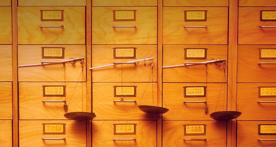旧金山唐人街的药材铺,挂在装满中药抽屉上的秤 (© Phil Schermeister/Corbis) © (Bing China)