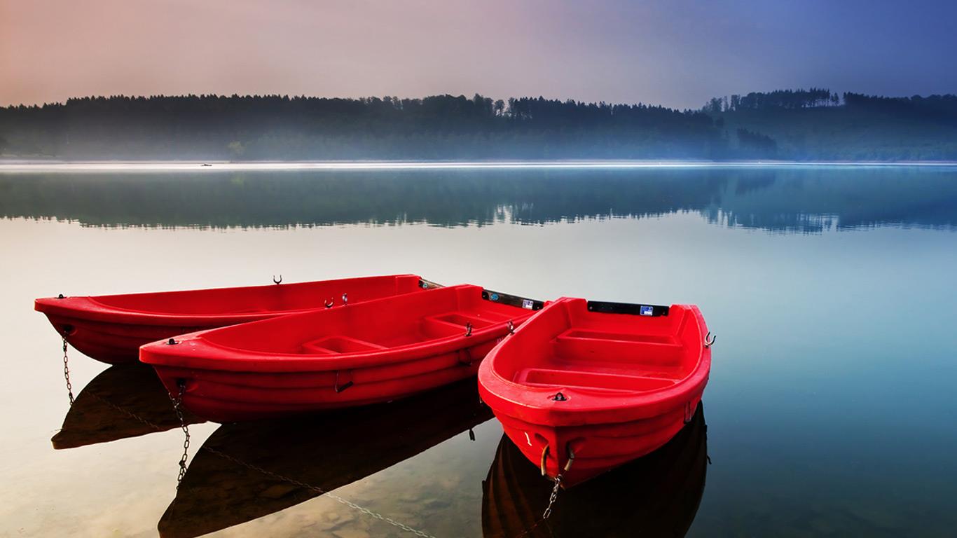 Drei rote Boote am Sorpesee, Sauerland, Nordrhein-Westfalen – Zweiter Preis GEO-Bing-Fotocontest (© Paul Wozniak)(Bing Deutschland)