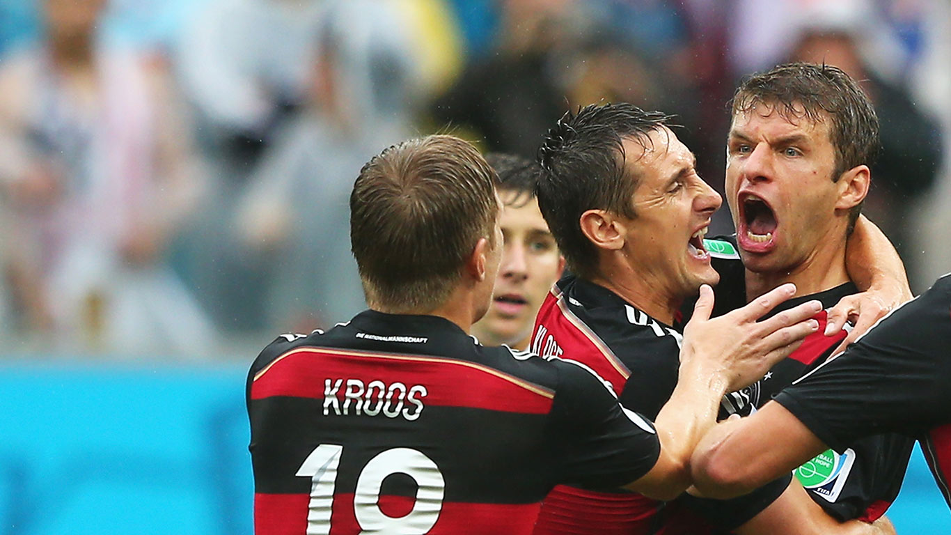 Deutschlands Thomas Müller (2. v.r.) feiert das 1:0 mit seinen Teamkameraden im Spiel gegen die USA bei der FIFA-Fußballweltmeisterschaft 2014 in Recife, Brasilien, am 26. 6. 2014 (©Alex Livesey/FIFA/FIFA via Getty Images)(Bing Deutschland)