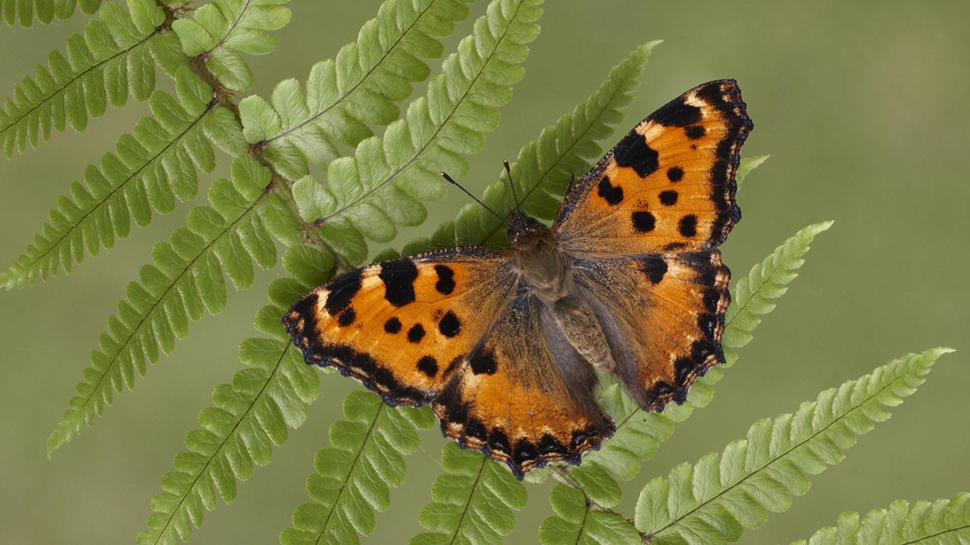 Ein „Großer Fuchs“ (Nymphalis polychloros) sonnt sich auf einem Farnwedel (© Gianpiero Ferrari/Minden Pictures)(Bing Deutschland)