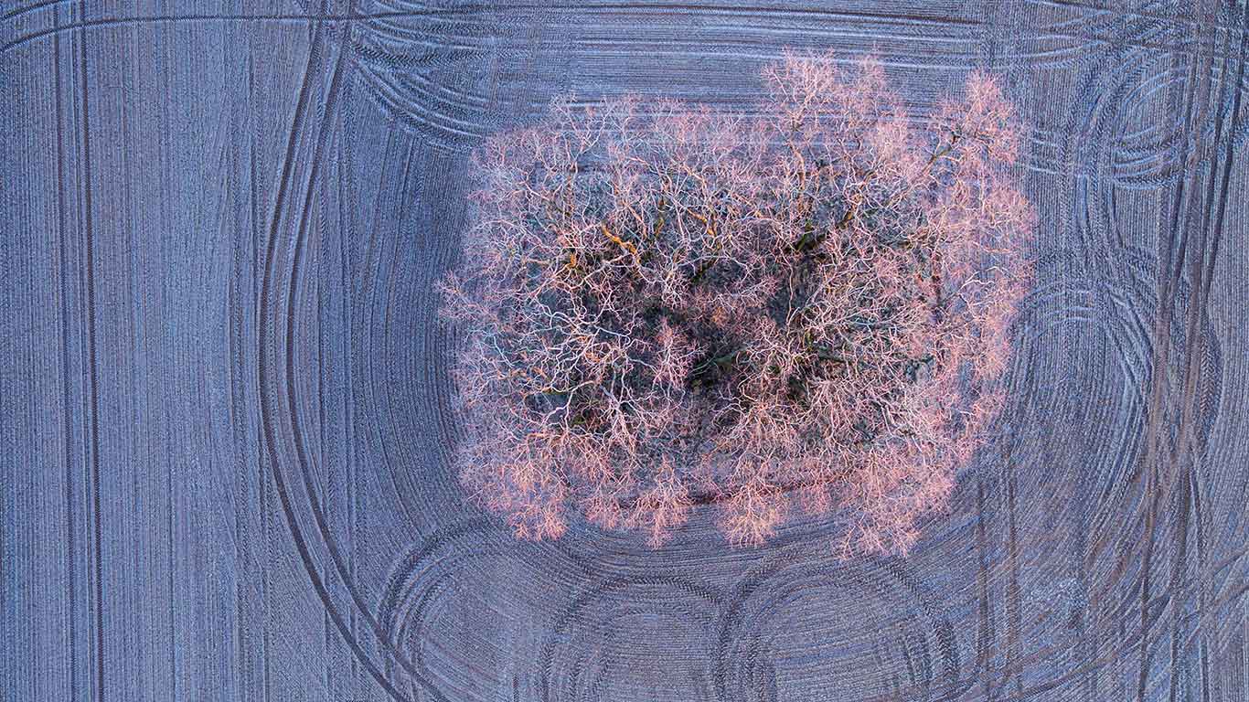 Warmes Licht der aufgehenden Morgensonne auf mit Frost bedeckten Bäumen auf einem Feld bei Jacobsdorf, Brandenburg, Deutschland (© picture alliance/Getty Images)(Bing Deutschland)