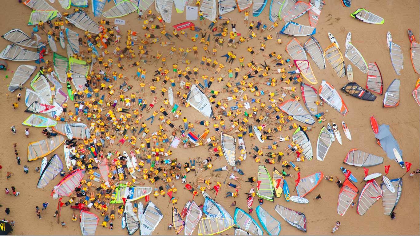 Deuxième jour du Defi Wind 2011 : les vents n’étant pas assez forts, la compétition n’a pas eu lieu. Gruissan, Aude, Languedoc-Roussillon (© George Steinmetz/Corbis)(Bing France)