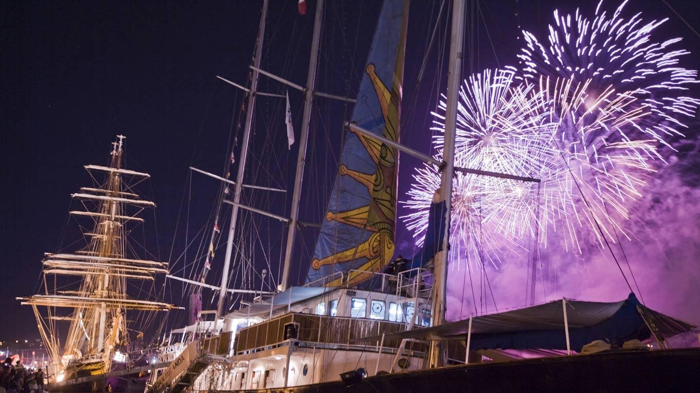 Feux d’artifice du 14 juillet lors de l’Armada 2008 de Rouen, avec en premier plan le trois-mâts uruguayen Capitan Miranda, Seine-Maritime (© Vincent Prevost/Corbis)(Bing France)