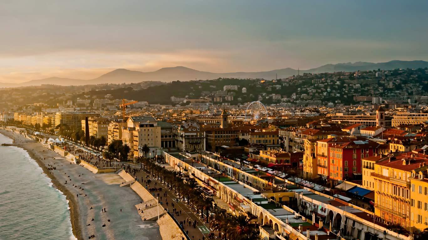 Vue plongeante sur la baie de Nice, la promenade des Anglais, le Cours Saleya et la grande roue de la place Masséna depuis le château de Nice, Alpes-Maritimes, PACA (© Rose Marie Nisolle)(Bing France)