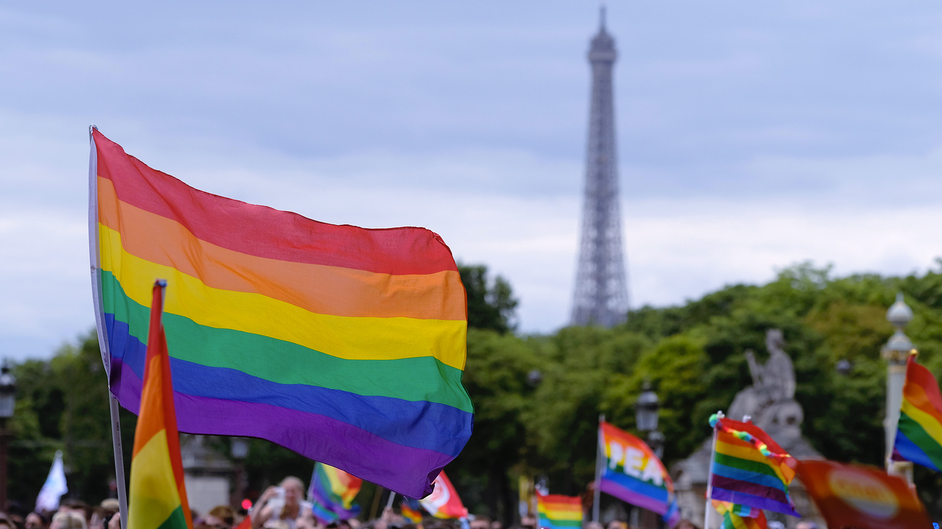 Drapeau arc-en-ciel flottant près de la Tour Eiffel lors de la Marche des fiertés de Paris (© Aflo Co. Ltd./Alamy Stock Photo)(Bing France)
