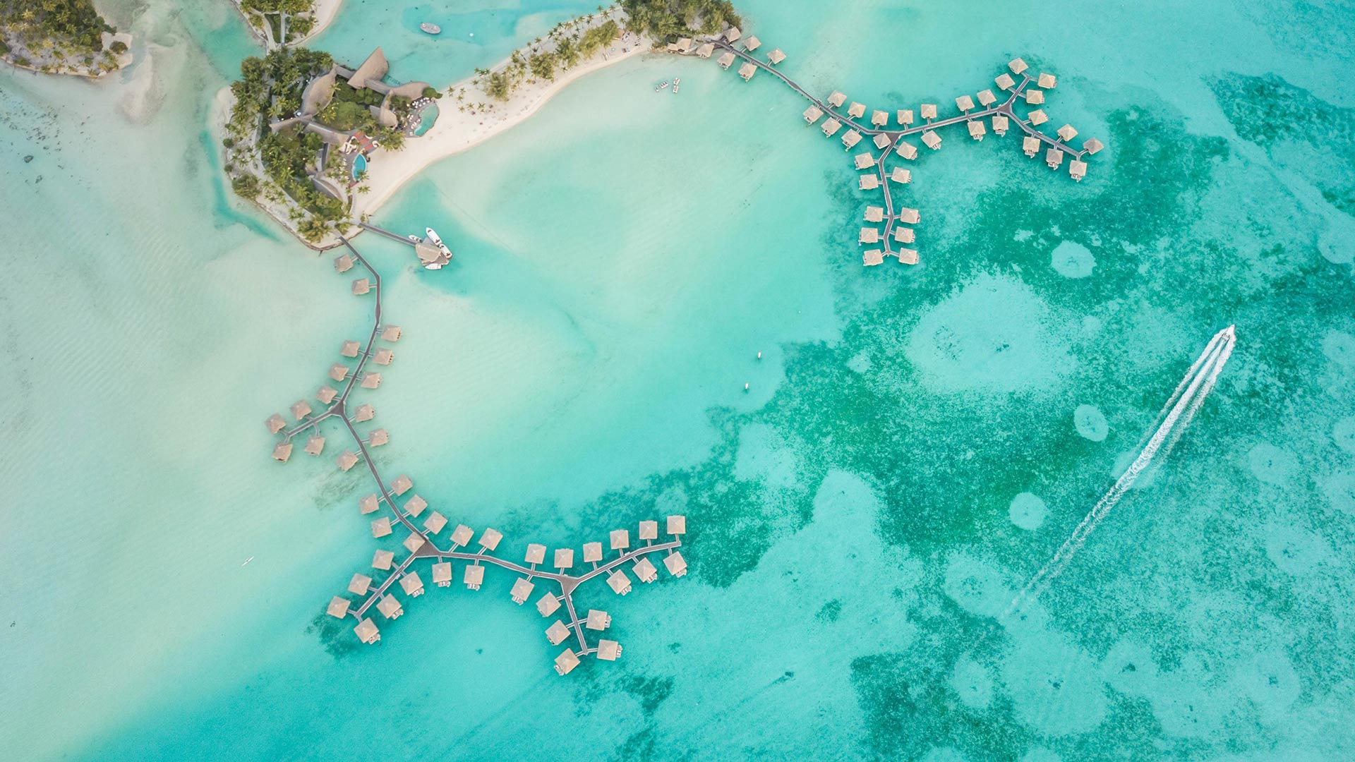Vue aérienne de bungalows sur l’île de Bora-Bora, Polynésie française (© Amazing Aerial Agency/Offset by Shutterstock)(Bing France)
