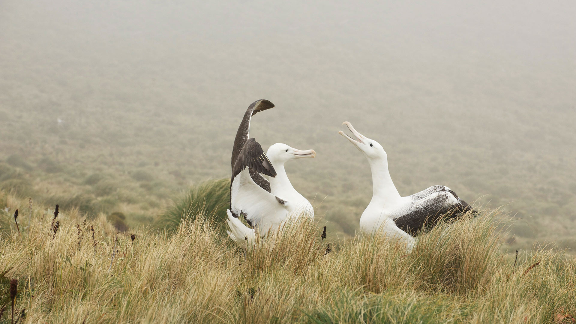 Couple d’albatros royal jouant sur l’île Campbell, Nouvelle-Zélande (© Mike Potts/Minden)(Bing France)