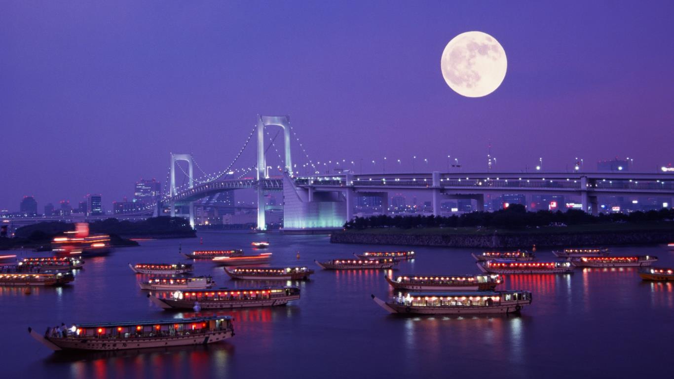 「レインボーブリッジと満月」東京, お台場 (© Hiroyuki Matsumoto/Stone/Getty Images)(Bing Japan)