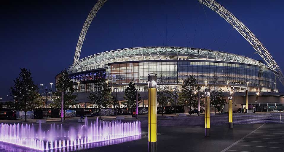 Wembley stadium, London, United Kingdom, night shot with purple fountain in foreground, HOK sport | Foster /Photolibrary © (Bing United Kingdom)
