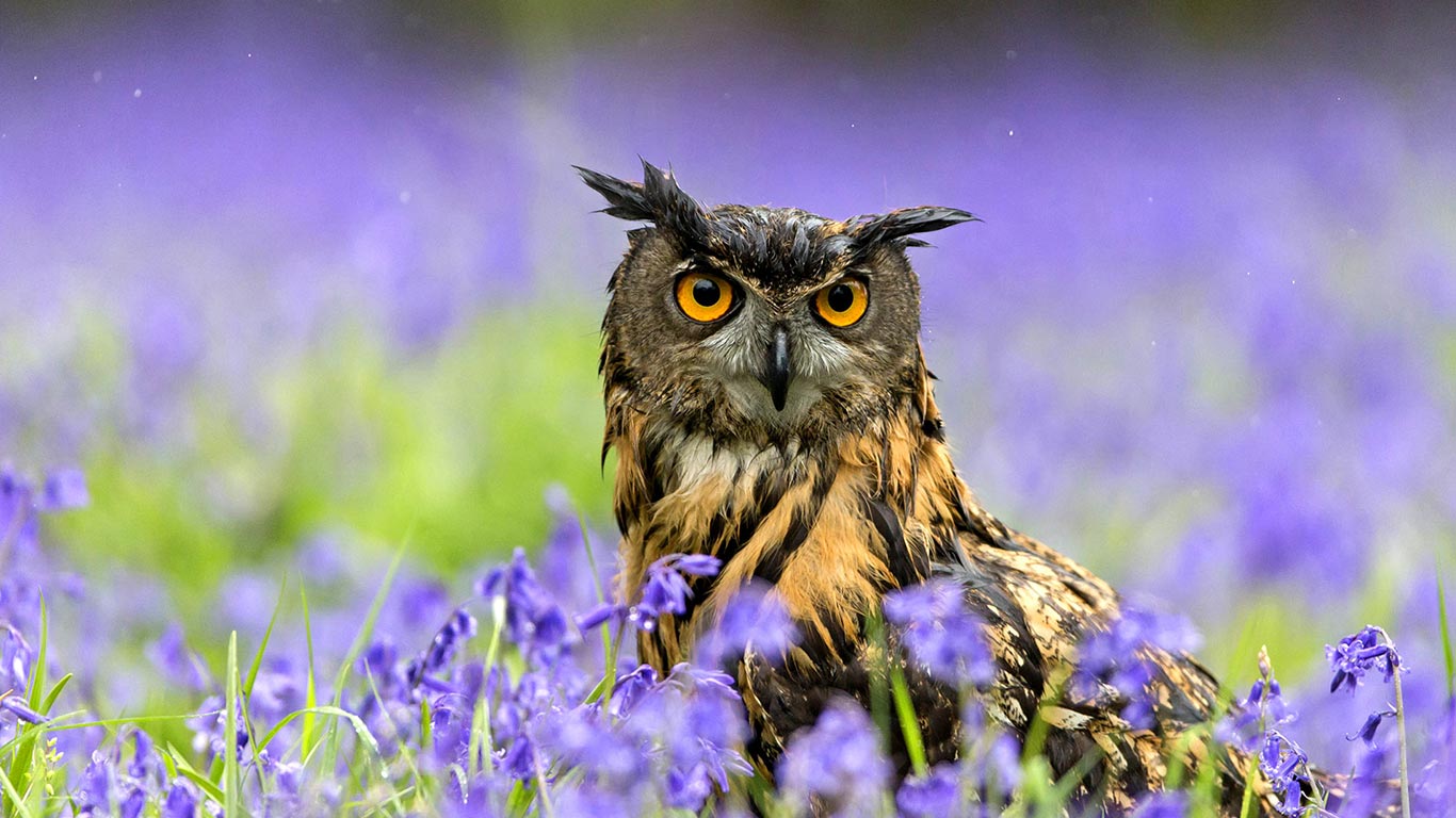 Eurasian Eagle-owl (Bubo bubo) standing amongst Bluebells during rainfall, Suffolk, England (© Paul Sawer/Corbis)(Bing United Kingdom)