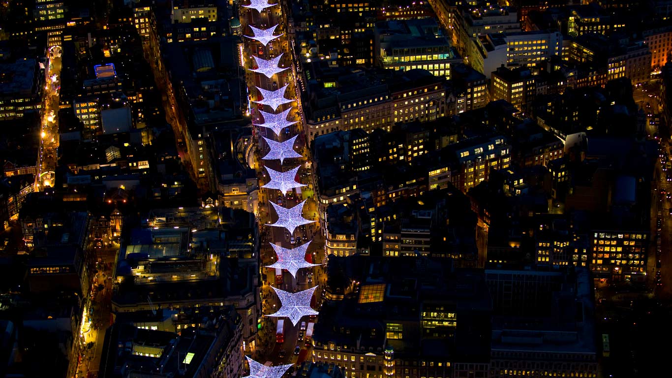 Aerial view of Christmas lights along Regent Street in London (© Jason Hawkes/Getty Images)(Bing United Kingdom)