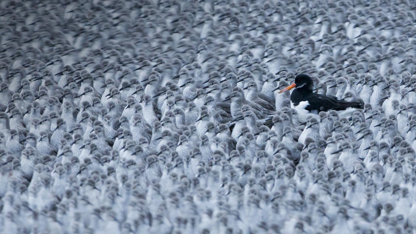 A Eurasian oystercatcher among a flock of roosting knots in Snettisham, Norfolk (© Paul Sawer/Minden Pictures)(Bing United Kingdom)