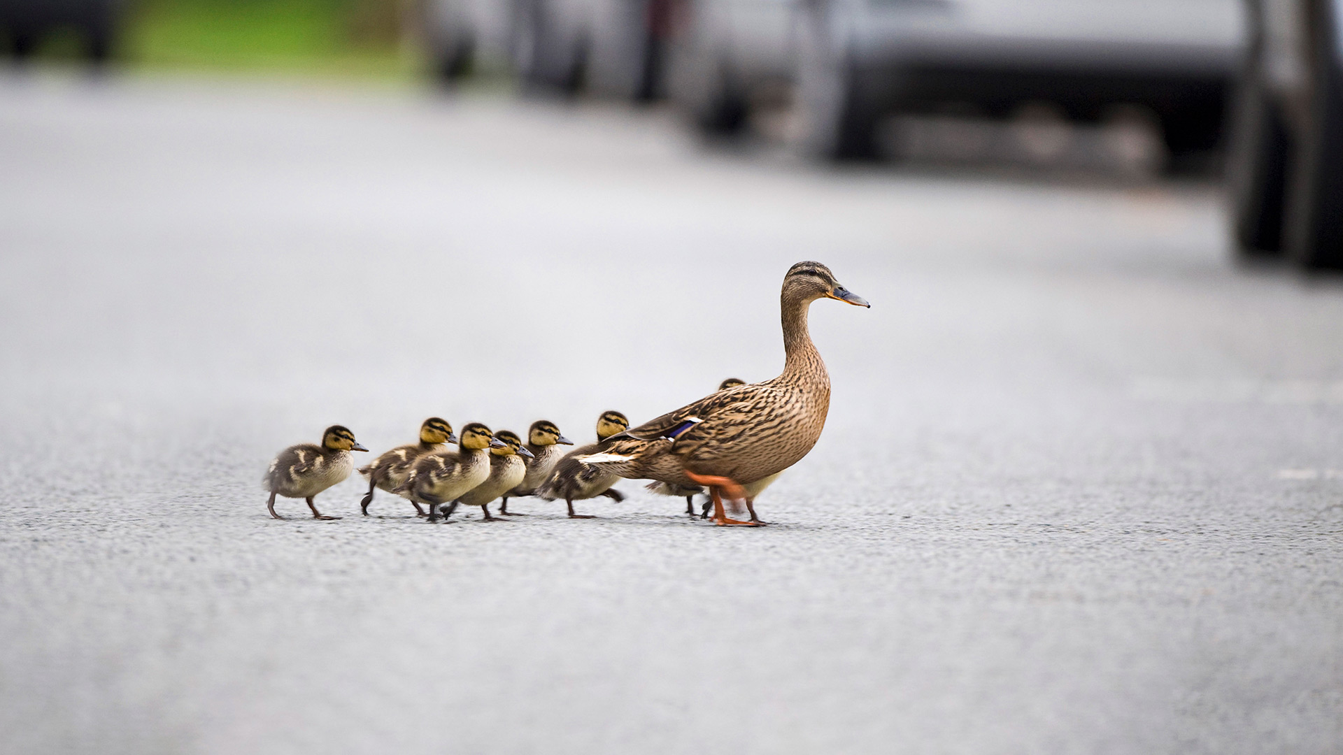 Mallard, Anas platyrhynchos, mother leading ducklings across road, Arundel, Sussex (© David Tipling/Universal Images Group via Getty Images)(Bing United Kingdom)