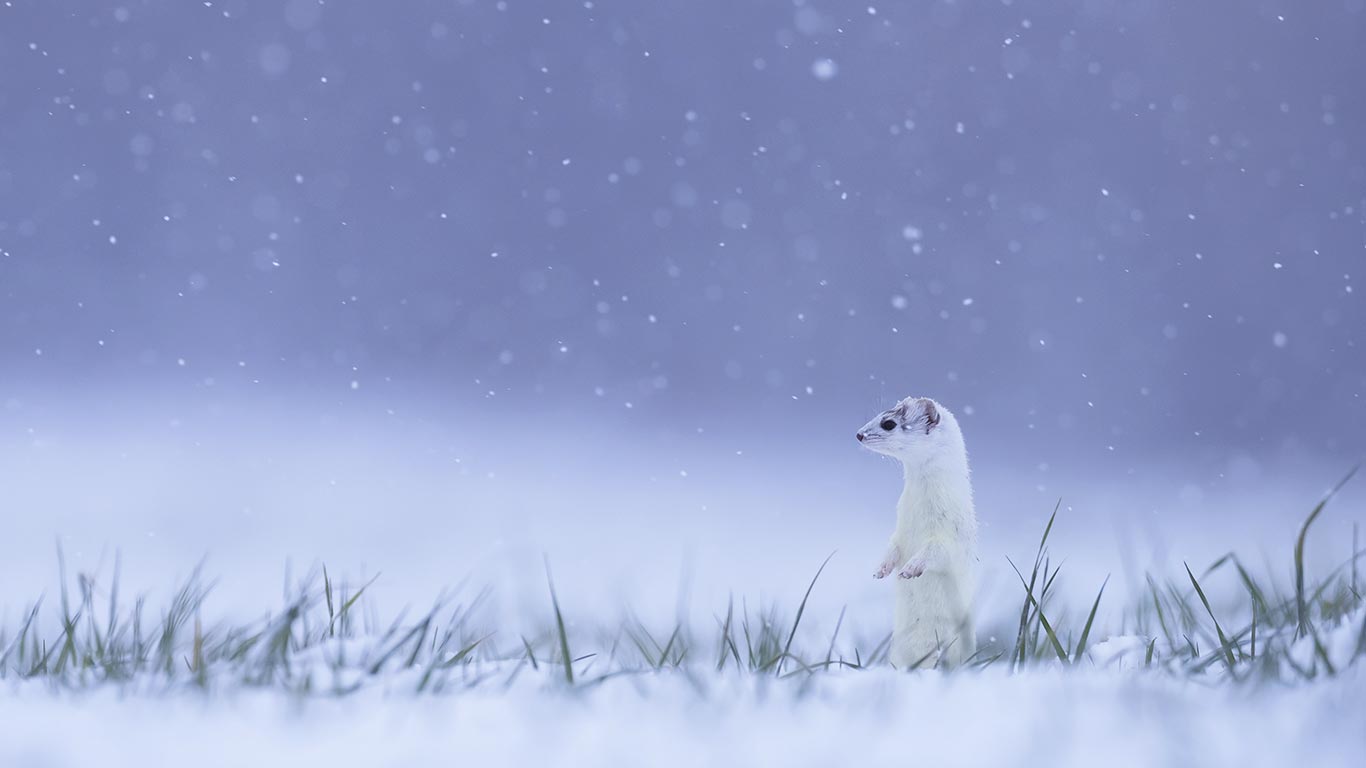 Une Hermine arborant son pelage d’hiver dans la neige, Jura, France (© Tim Fitzharris/Minden Pictures)(Bing France)